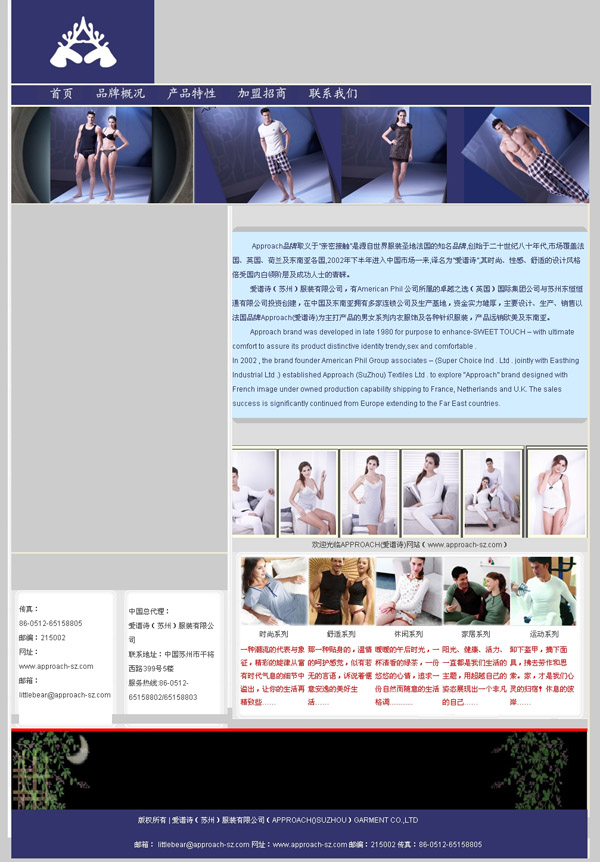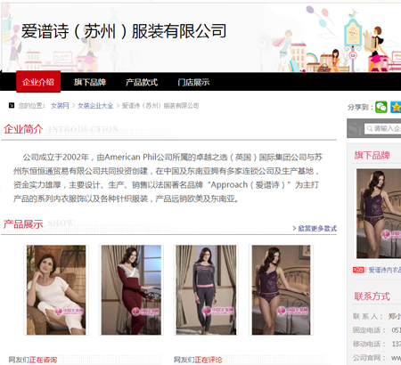 愛譜詩(蘇州)妝扮有限公司,有American Phil 公司所屬的良好之選(英國)國際團體公司與蘇州東恒恒通有限公司投資創建,在中國及東南亞擁有多家連鎖公司及生產基地,資金力氣雄厚,緊急操持、生產、販賣以法國品牌Approach(愛譜詩)為主打產物的男女系列褻服衣飾及種種針織妝扮,產物遠銷西歐及東南亞。