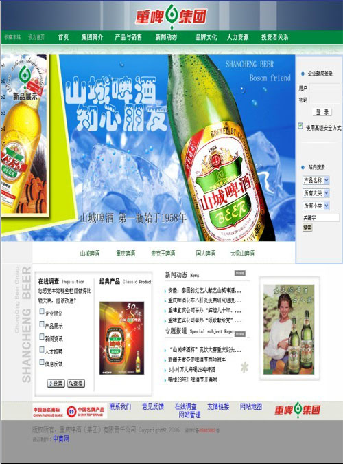 公司擁有“重慶”、“山城”、“國人”、“麥克王”、“大梁山”以及“天目湖”等品牌啤酒系列產品,以其口味純正、淡爽(醇厚)、包裝美觀大方、風味保鮮穩定、符合消費時尚等特點,在國內具有很高的知名度。1999年,“重慶啤酒”榮登“慶祝建國50周年”和“澳門回歸”國宴用酒;2001年,重啤集團的“重慶啤酒”、“山城啤酒”和“麥克王”啤酒等六個品牌又榮獲“中國優質新品啤酒”榮譽稱號!2002年,“重慶啤酒”又遠銷香港、澳門和臺灣地區。2004年,“山城啤酒”被認定為“中國馳名商標”;2005年,“山城啤酒”榮獲“中國名牌”稱號。