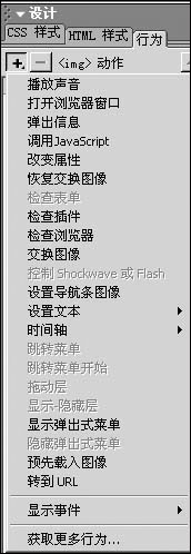 2. 選中圖片,單擊行為標簽,在此面板中,點擊“增加事件”按鈕,出現(xiàn)下拉菜單,如圖所示。