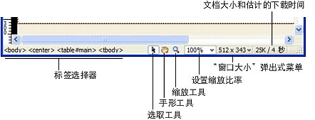 標簽選擇器顯示環繞當前選定內容的標簽的層次結構。單擊該層次結構中的任何標簽以選擇該標簽及其全部內容。單擊 可以選擇文檔的整個正文。若要設置標簽選擇器中某個標簽的 class 或 id 屬性,請右鍵單擊 (Windows) 或按住 Control 鍵并單擊 (Macintosh) 該標簽,然后從上下文菜單中選擇一個類或 ID。標簽選擇器是選擇標簽的首選方法,因為它可以確保您始終準確地選擇標簽。手形工具使您可以單擊文檔并將其拖入"文檔"窗口。單擊"選擇"工具可禁用手形工具。"縮放"工具和"設置縮放比率"彈出式菜單可以讓您為文檔設置縮放比率。"窗口大小"彈出式菜單(僅在"設計"視圖中可見)用來將"文檔"窗口的大小調整到預定義或自定義的尺寸。"窗口大出式菜單的右側是頁面(包括全部相關的文件,如圖像和其它媒體文件)的文檔大小和估計下載時間。