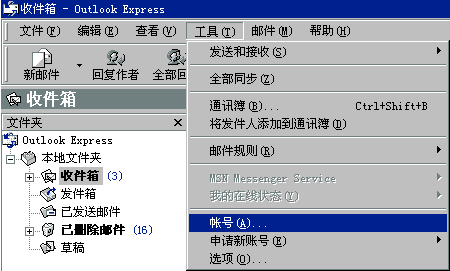 1.啟動Outlook Express; 2.依次單擊"工具->帳號"菜單項,打開"Internet 帳號"窗口;