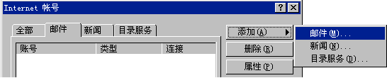 3.單擊郵件標簽(默認); 單擊"添加"按鈕,從彈出的菜單中選擇"郵件"選項將彈出Internet連接向導;