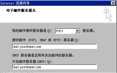 單擊"下一步"按鈕; 7.在彈出的"電子郵件服務器名"窗口中,系統默認"我的接收郵件服務器"為"POP3",不需要修改; 在接收郵件(POP3,IMAP或HTTP)服務器(I)"中填寫您接收郵件的服務器地址,例如:mail.yourdomain.com;