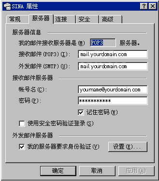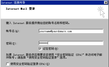其中帳號名是您的郵箱地址,例如您的郵箱地址是yourname@yourdomain.com,則帳號名是yourname@yourdomain.com;為了確保安全,密碼顯示為星號。如果您沒有輸入密碼或輸入密碼有誤,系統會在接收郵件時提示您輸入密碼。