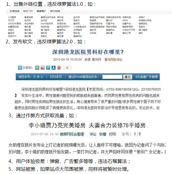 違反如下原則的站點將視嚴重程度受到不同程度的懲罰:降低搜索引擎系統評價、目錄或站點屏蔽清理出新聞源、整站屏蔽清理出新聞源。具體原則包括但不限于如下: