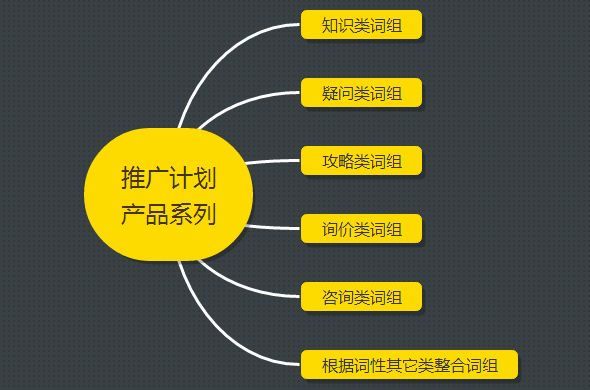 如上圖,根據用戶行為所處的不同階段,把你挖掘到的關鍵詞進行一級分類,對于百度來說就是構建推廣計劃,當然如Google Adwords習慣成為推廣系列,是同一個意思。整個架構的的一級分類也就自然成型了。對于一個規模不大,目的性明確的賬戶,基本上可以按照如下圖的詞類形式進行劃分。